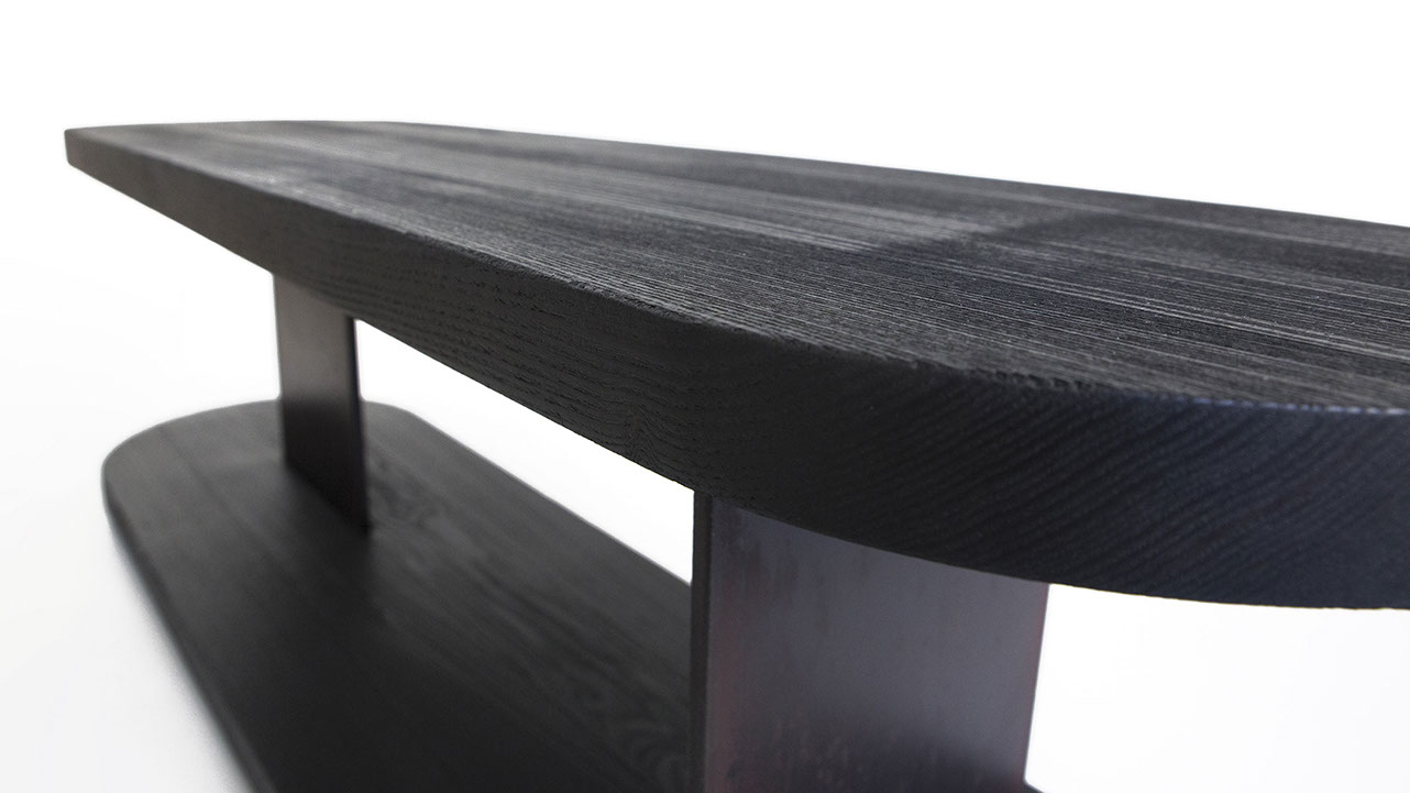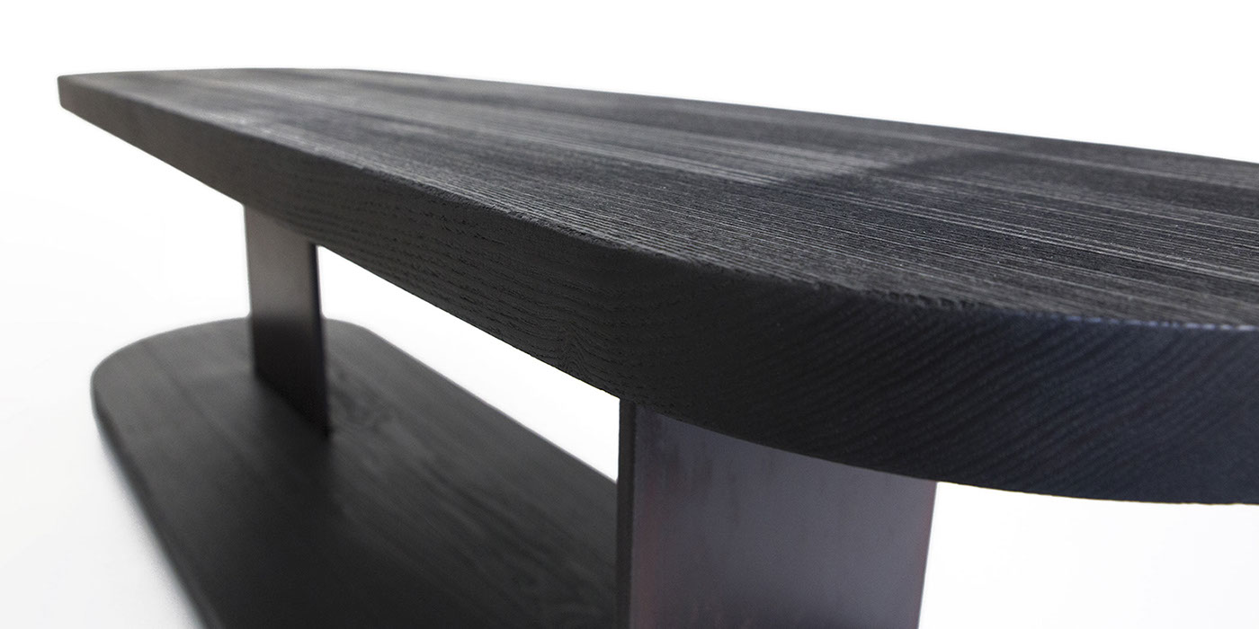 CARBON was created by the fascination for the finishing technique of wood carbonizing. The result is a very pure sideboard, which focuses on the appearance of burned wood surfaces. After the process of burning, the fire leaves a highlighted wood structure full of character. A varnished finish prevents staining and creates an exciting feel that wants to be touched.