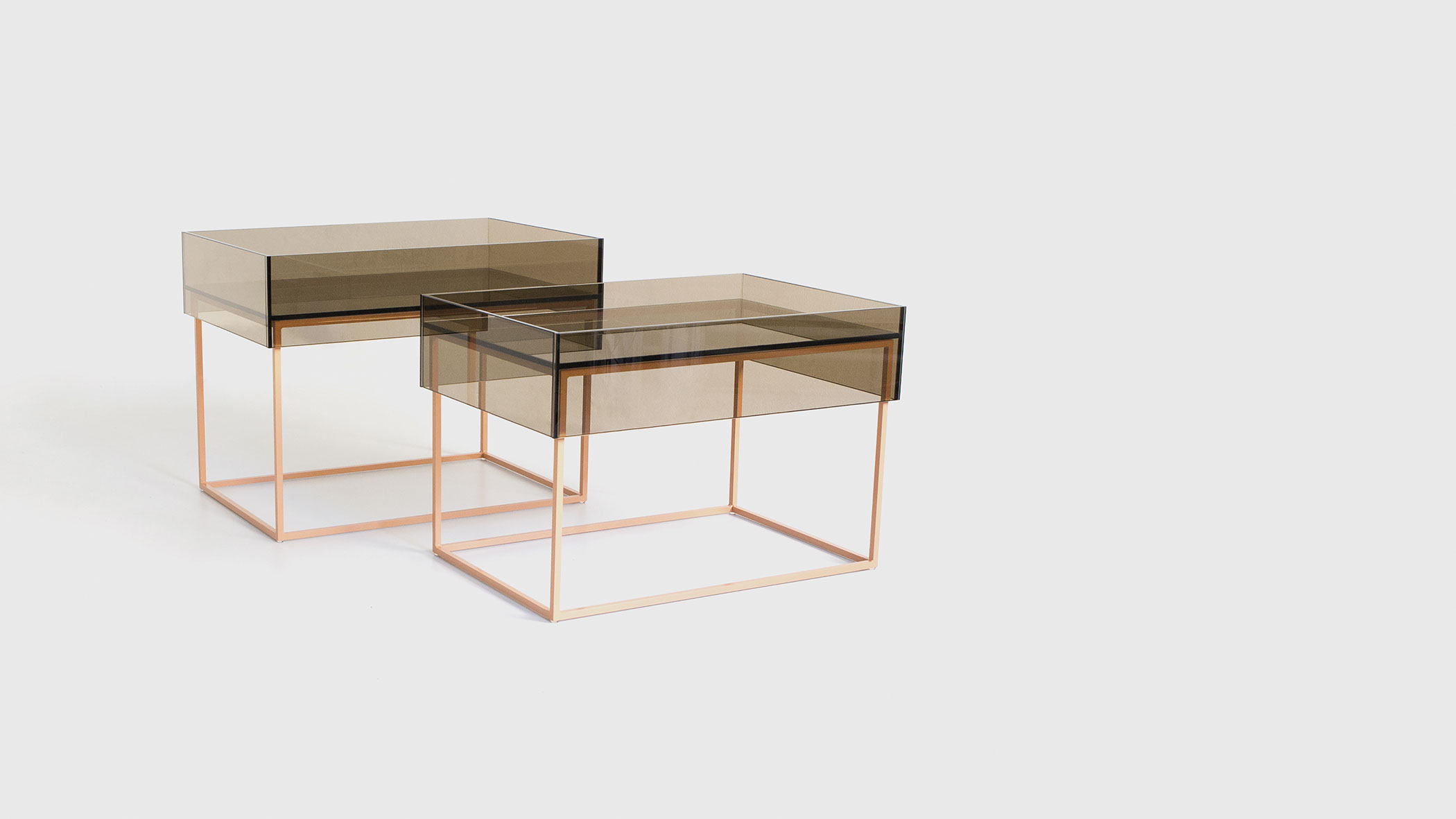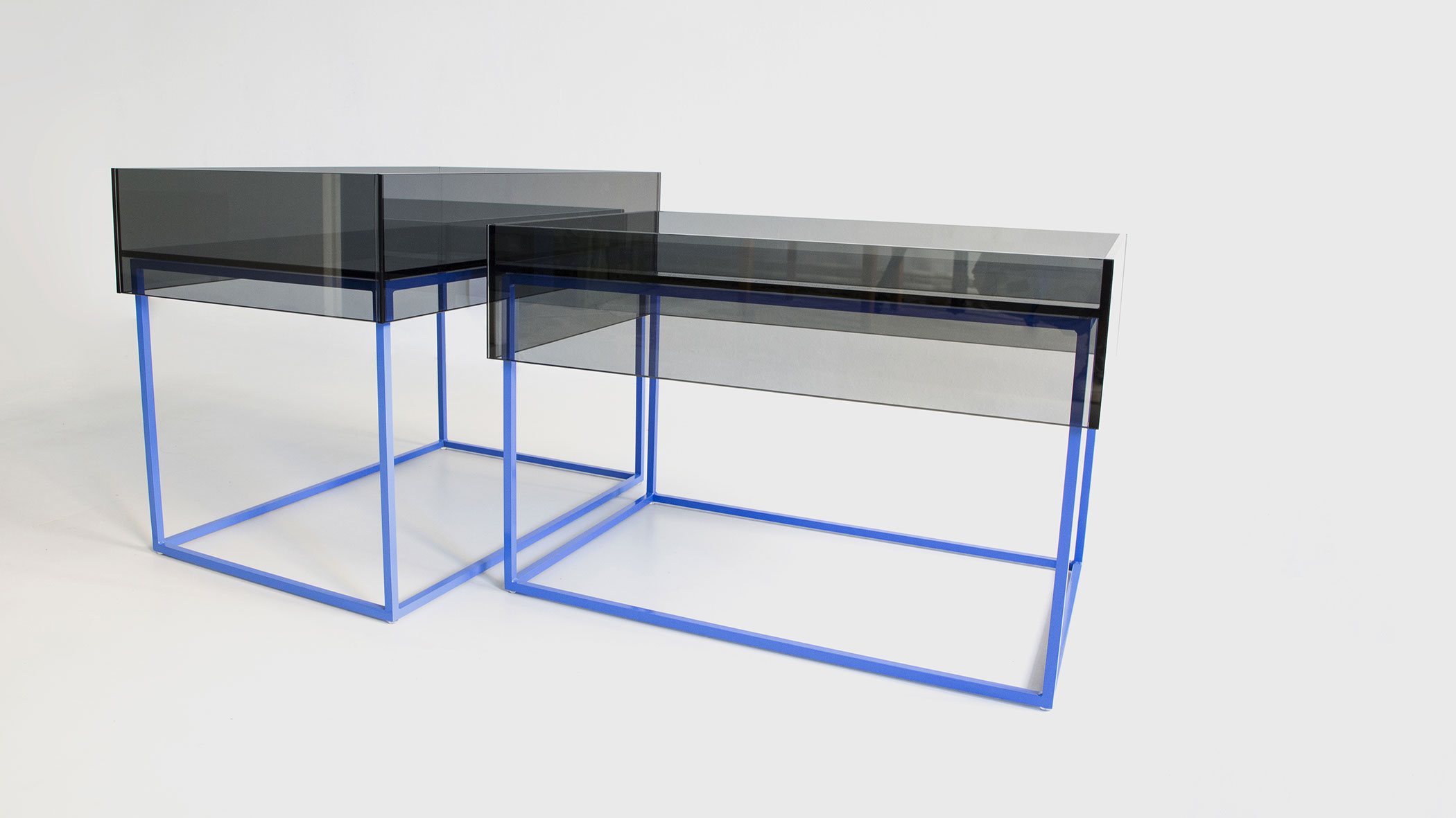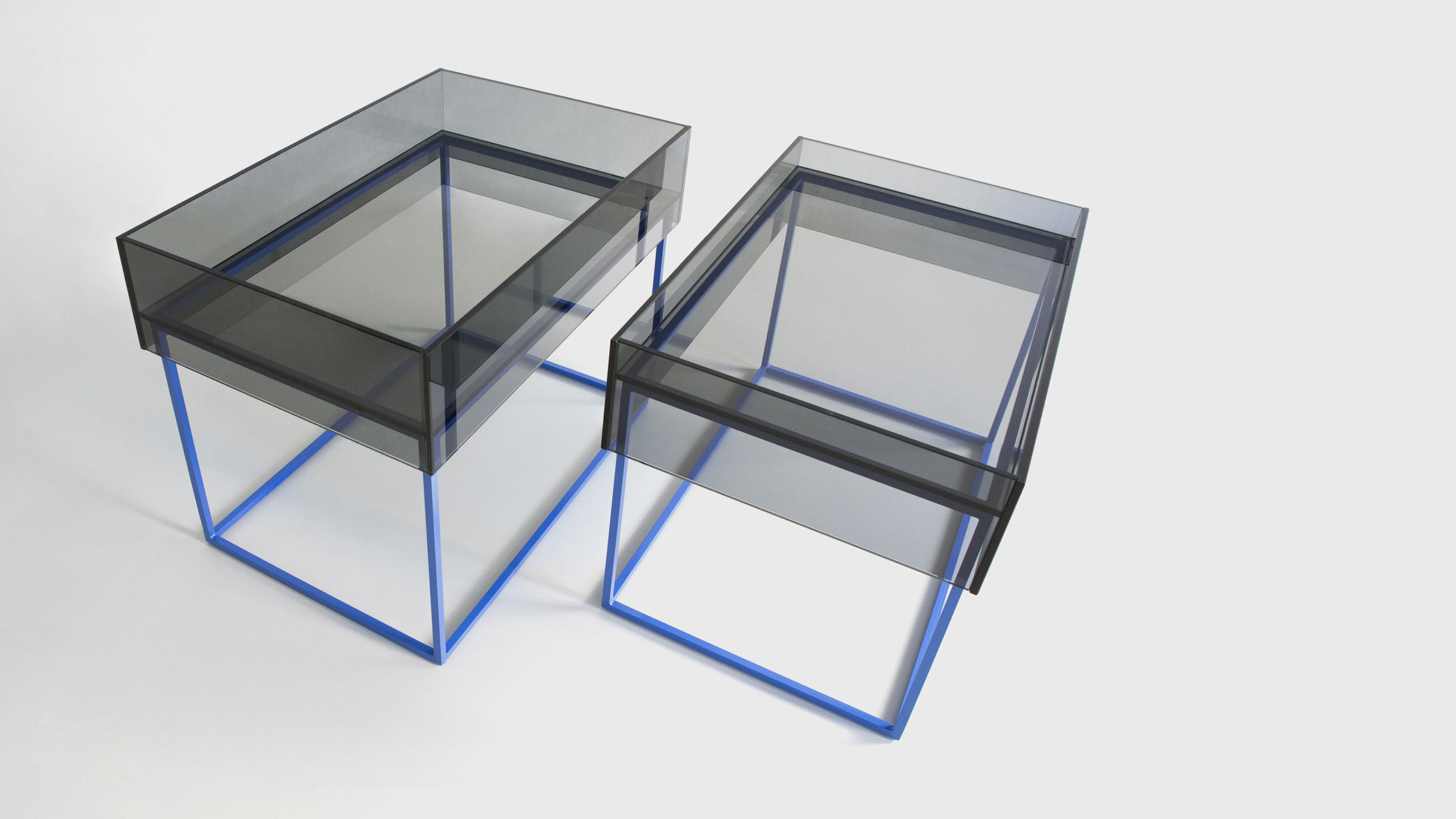 POOL is a base frame and a tabletop that can be used in two ways. Depending on one´s wishes, the different heights of the glass enclosure will either help to securely place items on top or immerse the content into the color mood of the glass table.